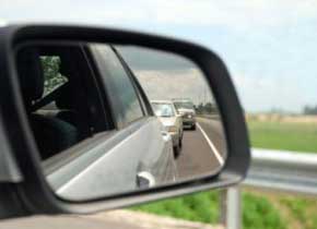 Do not develop a fixed stare. Use your rear-view mirror to frequently (about every 10 seconds) check the traffic behind you. This will alert you if someone is moving up too quickly or tailgating you. Check the traffic behind you when changing lanes, backing up, slowing down quickly, or driving down a long, steep hill.
