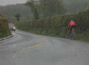 A bicyclist might turn sharply to avoid a sewer grate, something in the road, or a door being opened from a parked car. On a wet road, always give bicyclists extra room.
